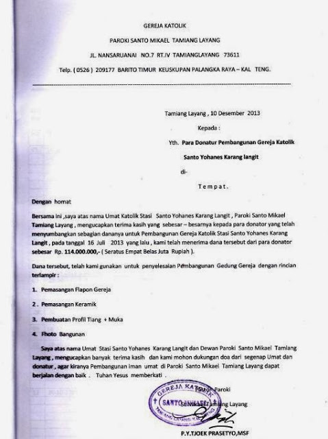 Surat Resmi Ucapan Terima Kasih Penerimaan Bantuan dari Paroki Tamiang Layang untuk Gereja Karang Langit (Tahap I) |