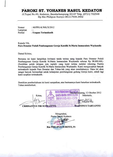 Surat Resmi Ucapan Terima Kasih Penerimaan Bantuan dari Paroki Kedaton untuk Gereja Waykandis |