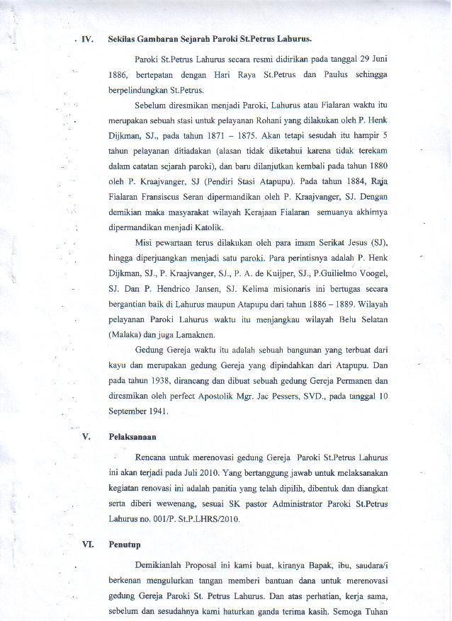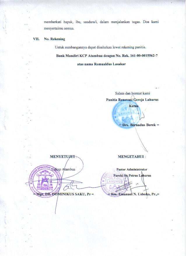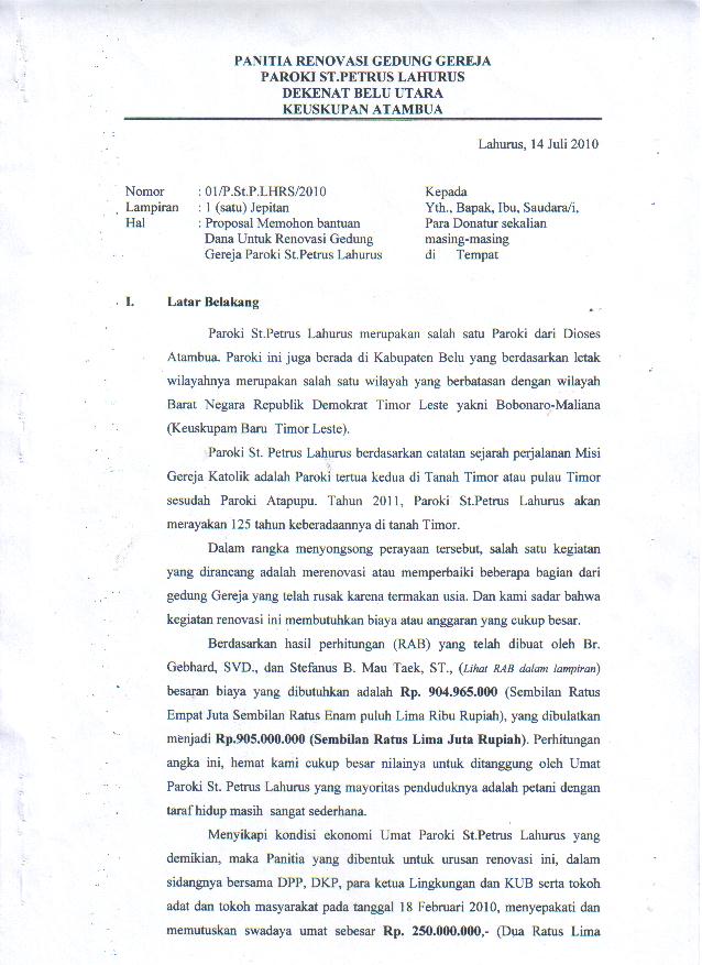Surat Resmi Ucapan Terima Kasih Penerimaan Bantuan dari Paroki Lahurus untuk Gereja Paroki Lahurus |