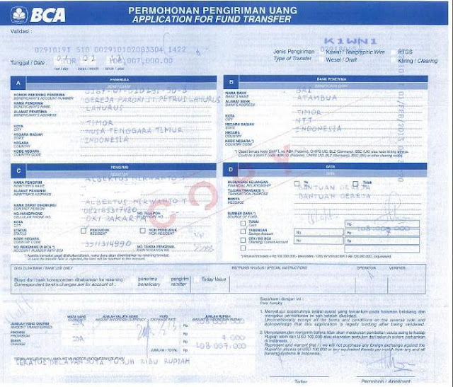 Bukti Transfer Dana Bantuan untuk Paroki Lahurus sebesar Rp 108.000.000,00. |