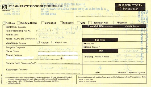 Bukti Transfer Dana Bantuan untuk Paroki Lahurus sebesar Rp 73.000.000,00. |