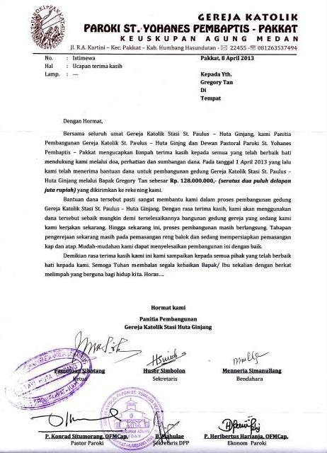 Surat Resmi Ucapan Terima Kasih Penerimaan Bantuan dari Paroki Pakkat, Humbang Hasundutan |