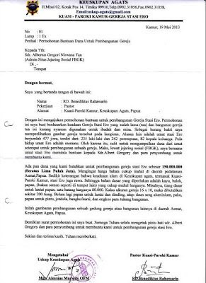 Surat Resmi Ucapan Terima Kasih Penerimaan Bantuan dari Paroki Kamur, Agats, Papua |