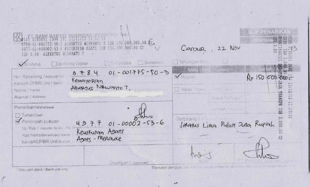 Dana yang masuk melalui Rekening PPGK di atas telah kami transfer ke Rekening Keuskupan Agats sebesar Rp 150.000.000 pada tanggal 22 November 2013 (bukti transfer terlampir).