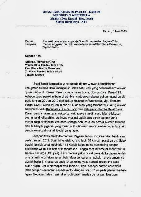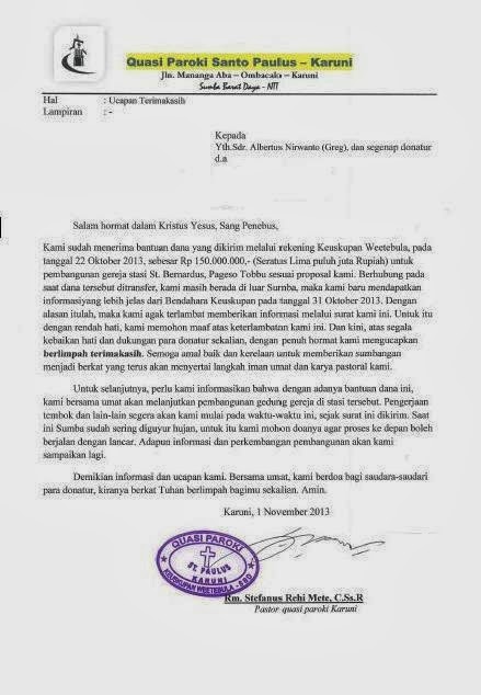 Surat Resmi Ucapan Terima Kasih Penerimaan Bantuan dari Paroki Karuni, Sumba Barat Daya |
