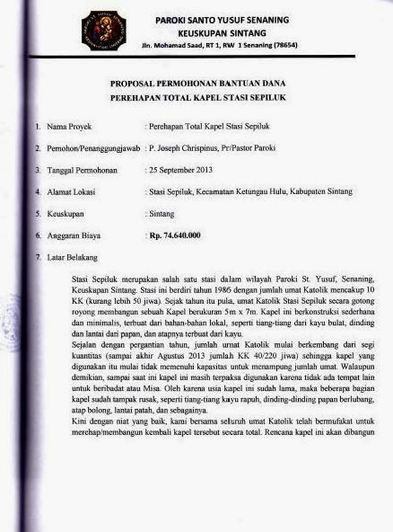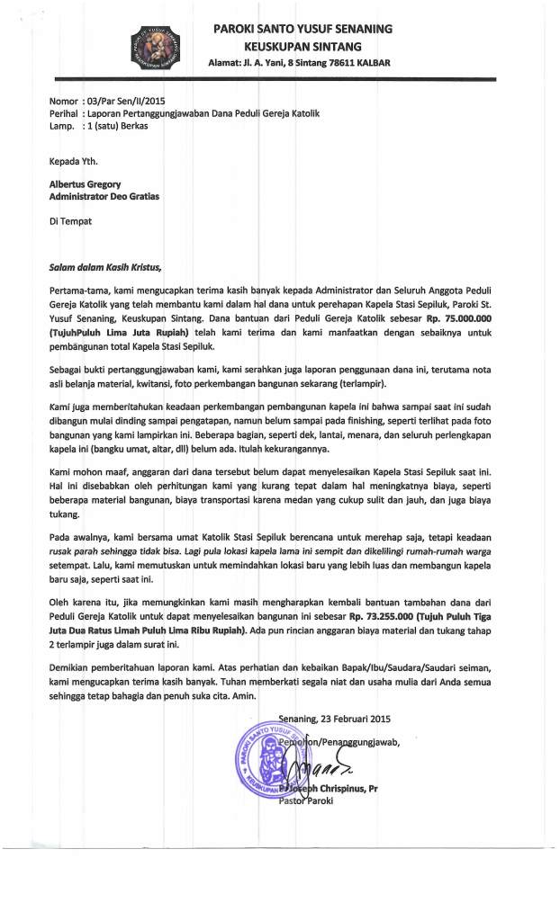 Surat Resmi Ucapan Terima Kasih Penerimaan Bantuan dari Paroki Senaning, Sintang |