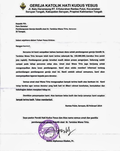 Surat Resmi Ucapan Terima Kasih Penerimaan Bantuan dari Paroki Rantau Pulut, Seruyan |
