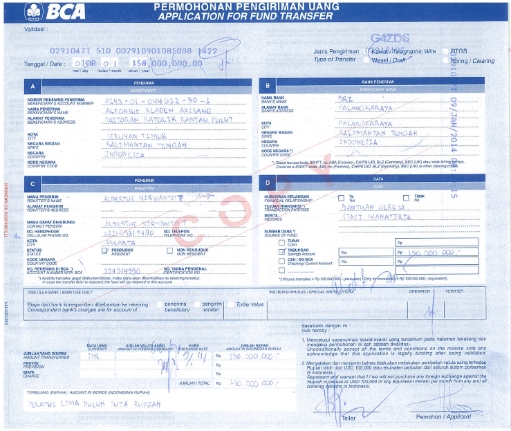 Bukti Transfer Dana Bantuan untuk Paroki Rantau Pulut sebesar Rp 150.000.000,00. |