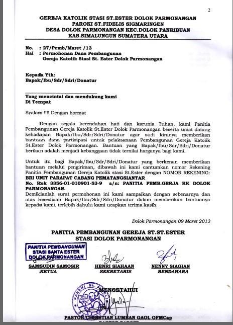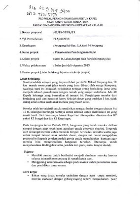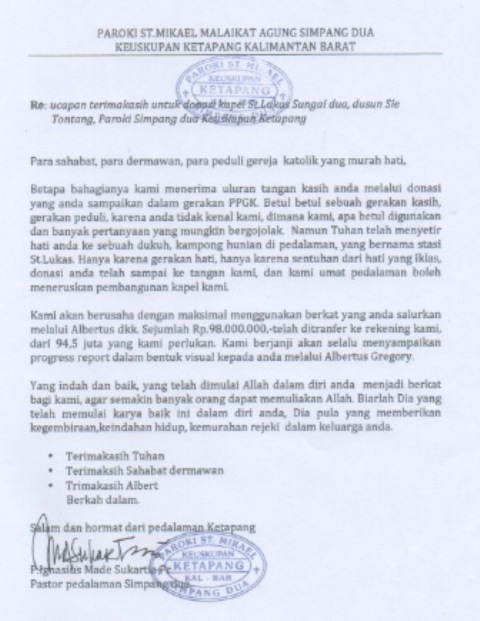Surat Resmi Ucapan Terima Kasih Penerimaan Bantuan dari Paroki Simpang Dua, Ketapang |
