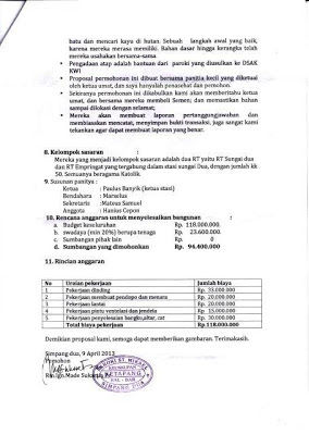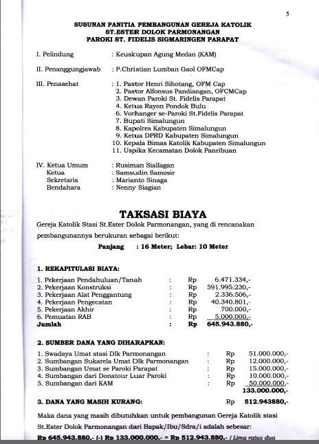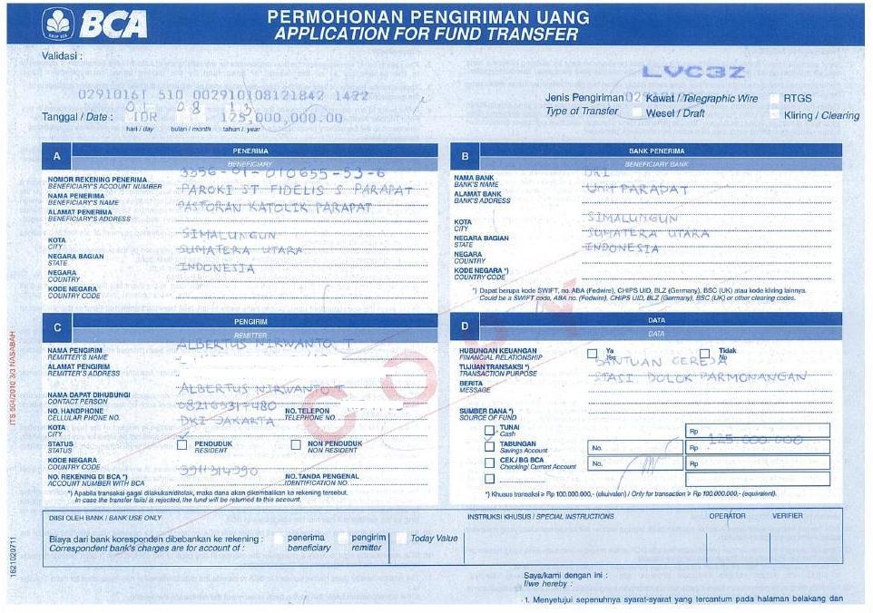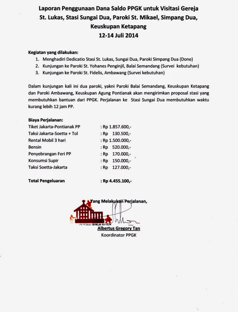 Dana yang masuk melalui Rekening PPGK di atas telah kami transfer ke Rekening Paroki Simpang Dua sebesar Rp 98.000.000 pada tanggal 15 Agustus 2013 (bukti transfer terlampir).
