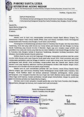 Surat Resmi Ucapan Terima Kasih Penerimaan Bantuan dari Paroki Parlilitan, Humbang Hasundutan |
