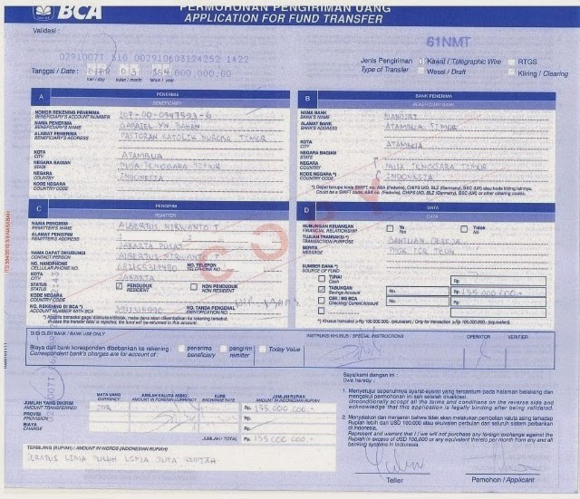 Bukti Transfer Dana Bantuan untuk Paroki Nurobo sebesar Rp 155.000.000,00. |