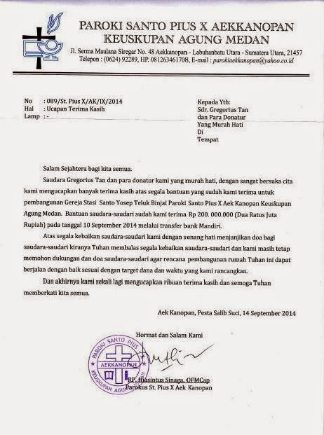 Surat Resmi Ucapan Terima Kasih Penerimaan Bantuan dari Paroki Aek Kanopan, Labuhan Batu Utara |