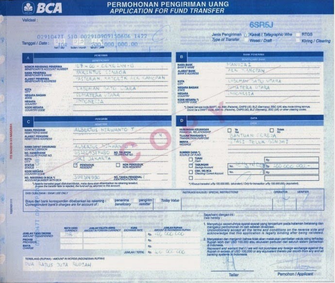 Bukti Transfer Dana Bantuan untuk Paroki Aek Kanopan sebesar Rp 200.000.000,00. |