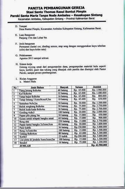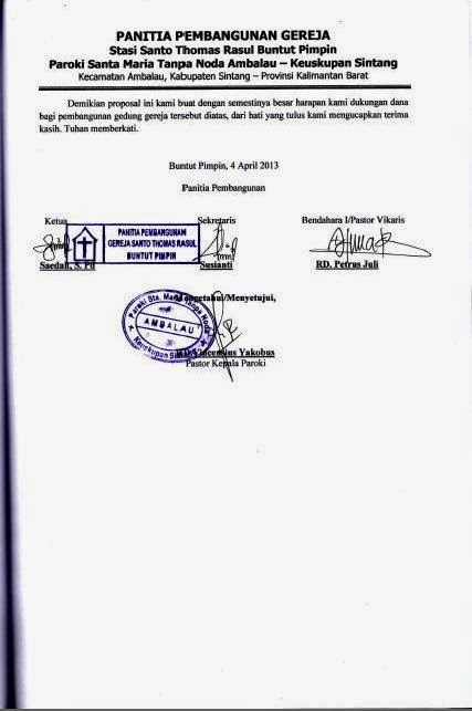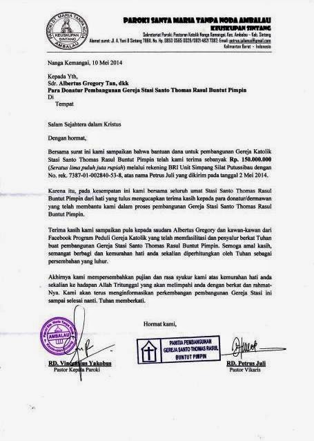 Surat Resmi Ucapan Terima Kasih Penerimaan Bantuan dari Paroki Ambalau, Sintang, Kalimantan Barat |