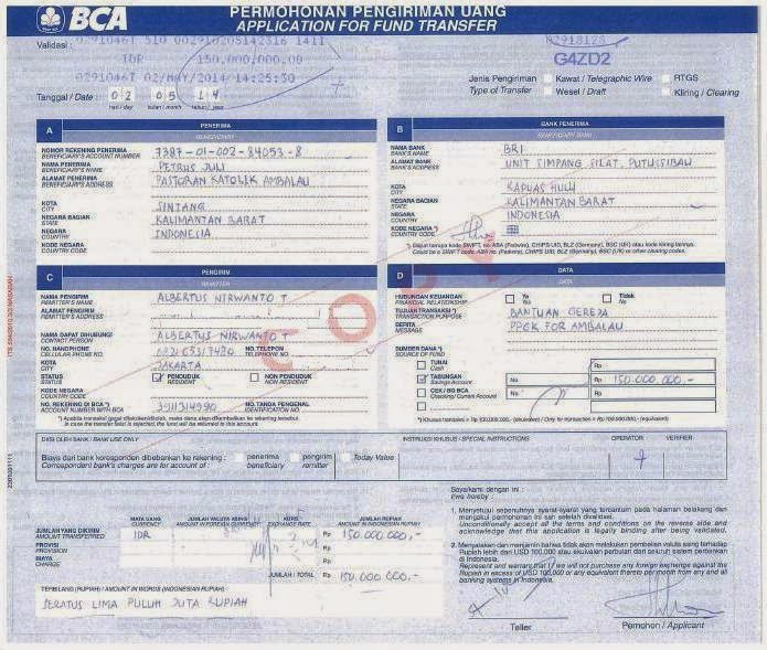 Dana yang masuk melalui Rekening PPGK di atas telah kami transfer ke Rekening Paroki St. Maria Tak Tanpa Noda, Ambalau sebesar Rp 150.000.000 pada tanggal 2 Mei 2014 (bukti transfer terlampir).