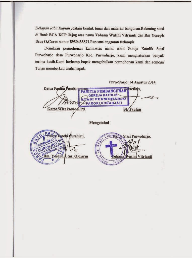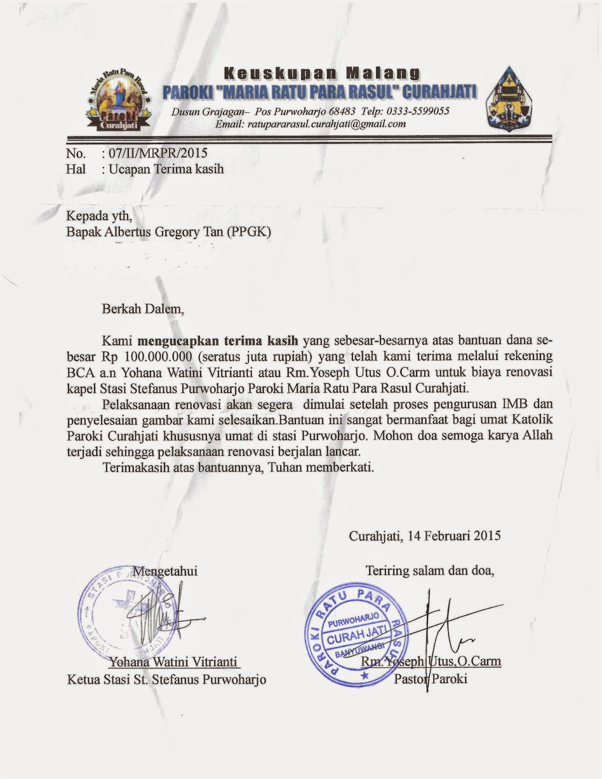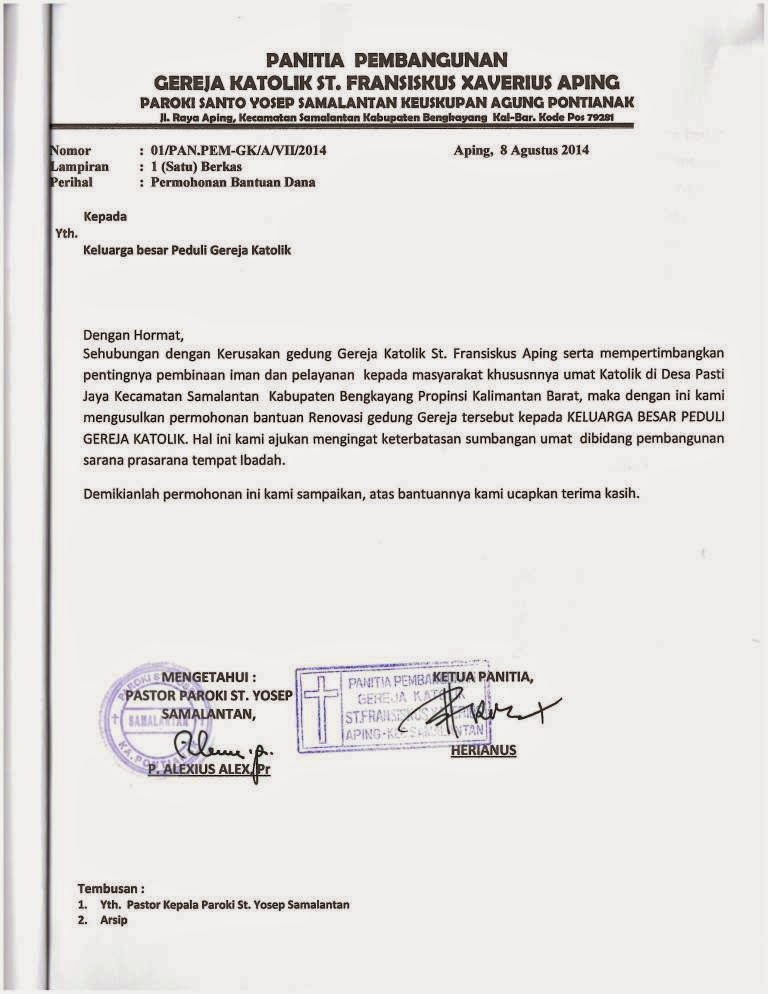 Surat Resmi Ucapan Terima Kasih Penerimaan Bantuan dari Paroki Samalantan, Bengkayang, Kalimantan Barat |