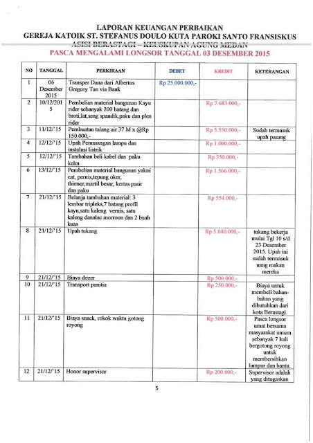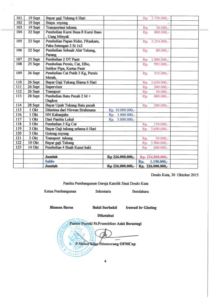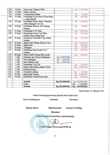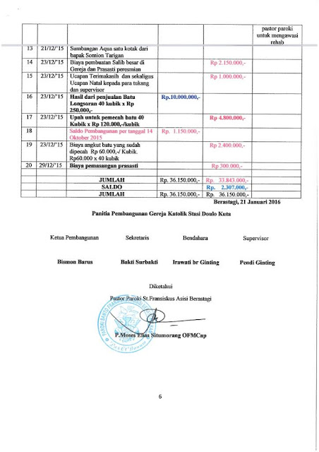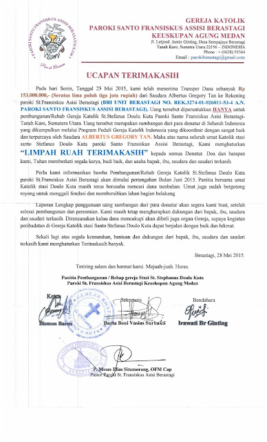 Syukur kepada Allah atas terselesaikannya kegiatan pencarian dana untuk Gereja Katolik St. Stephanus, Doulu Kuta, Karo, Keuskupan Agung Medan. Jumlah total dana bantuan yang terkumpul adalah sebanyak Rp 156.139.532,- dengan rincian sebagai berikut: