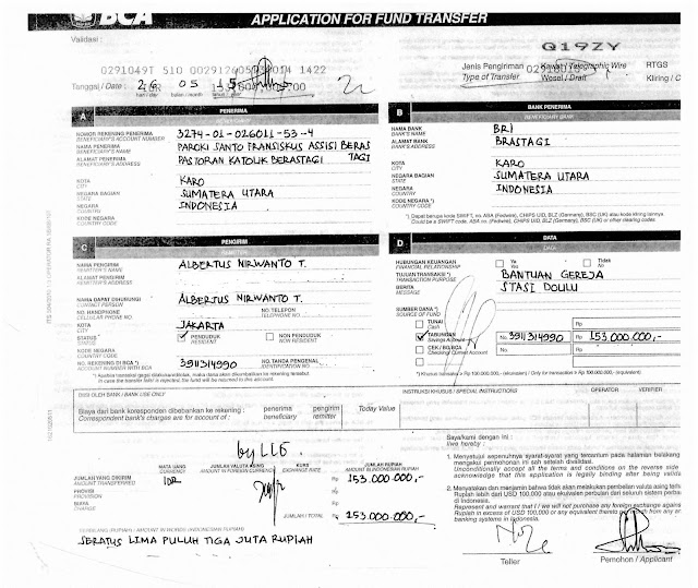 Bukti Transfer Dana Bantuan untuk Paroki Berastagi sebesar Rp 153.000.000,00 |
