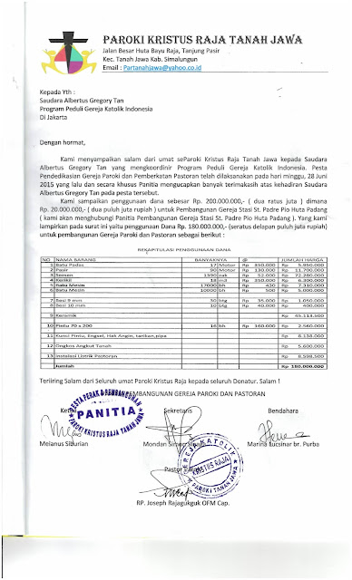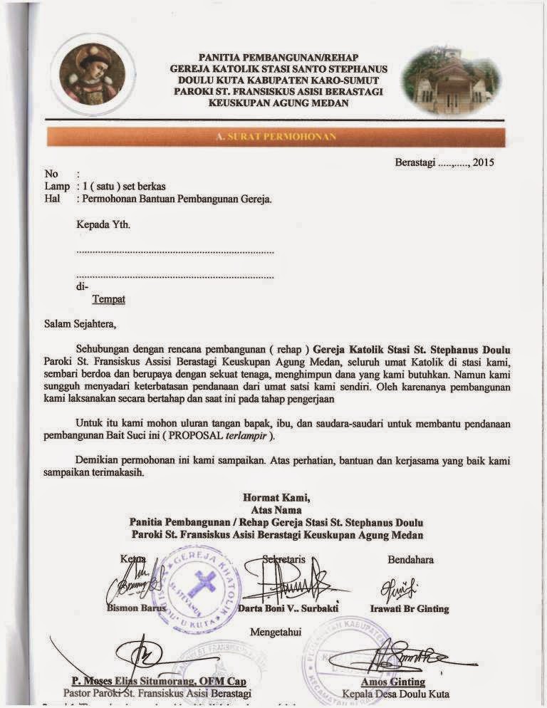 Surat Resmi Ucapan Terima Kasih Penerimaan Bantuan dari Paroki Berastagi, Karo, Sumatera Utara |