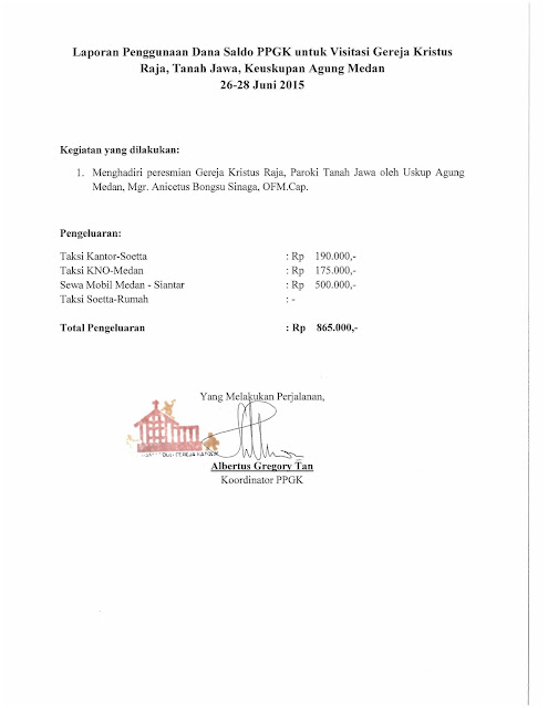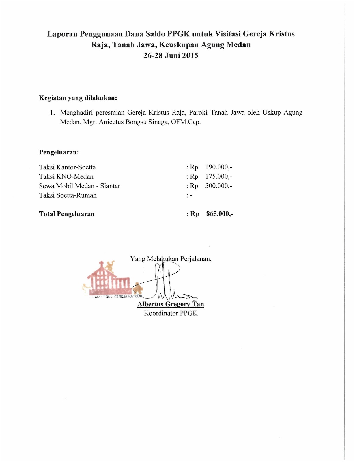 Dana yang masuk melalui Rekening PPGK di atas telah kami transfer ke Rekening Paroki St. Fransiskus Assisi, Brastagi (BRI a/n Paroki Santo Fransiskus Assisi Brastagi) sebesar Rp 153.000.000 pada tanggal 26 Mei 2015 (bukti transfer terlampir).