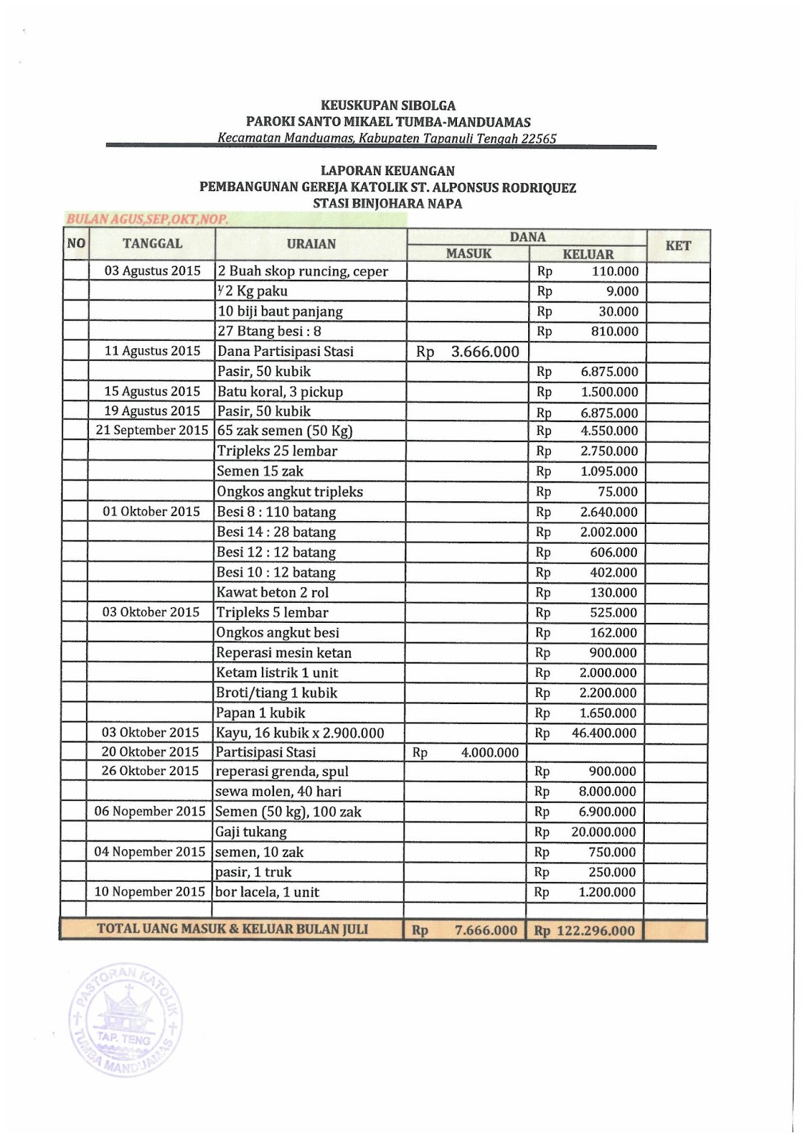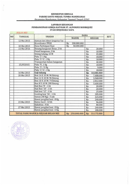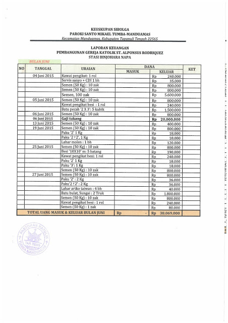 Syukur kepada Allah atas terselesaikannya kegiatan pencarian dana untuk Gereja Katolik St. Alfonsus Rodriguez, Binjohara Napa, Tapanuli Tengah, Keuskupan Sibolga. Jumlah total dana bantuan yang terkumpul adalah sebanyak Rp 203.261.224,- dengan rincian sebagai berikut: