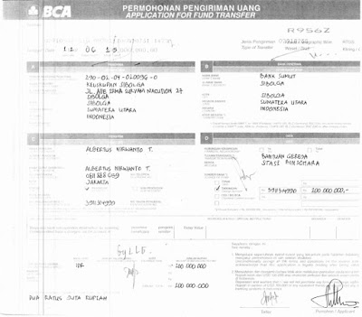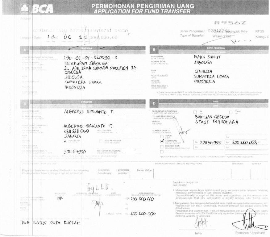 Bukti Transfer Dana Bantuan untuk Paroki Tumbajae-Manduamas sebesar Rp 200.000.000,00 |