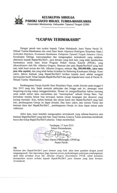 Surat Resmi Ucapan Terima Kasih Penerimaan Bantuan dari Paroki Tumbajae, Tapanuli Tengah, Sumatera Utara |