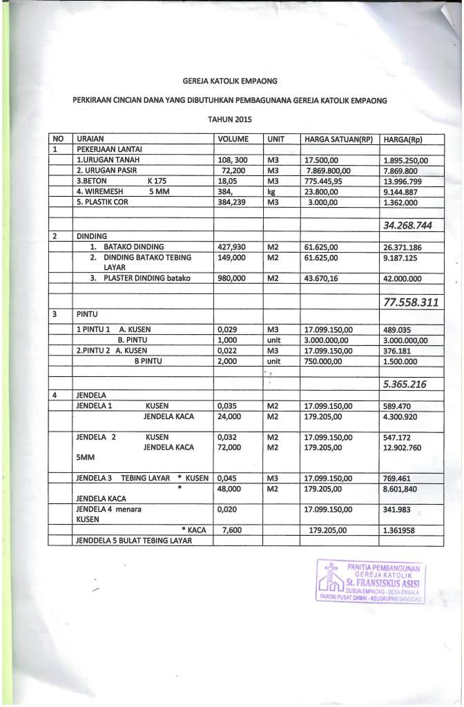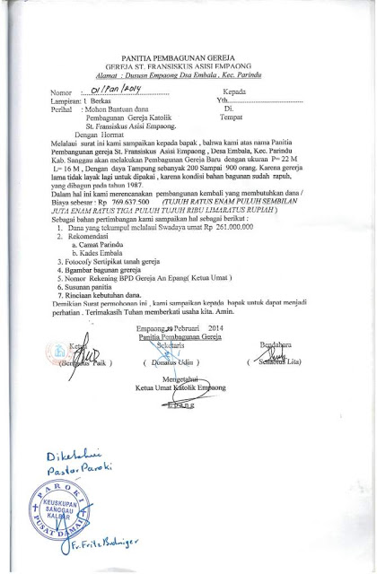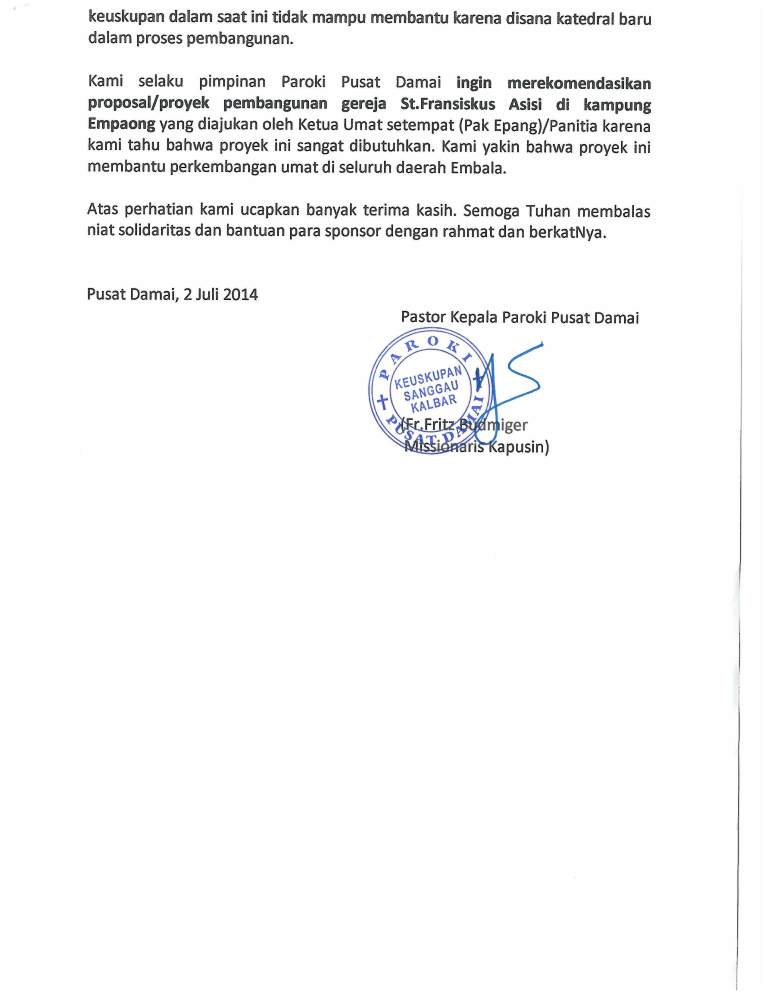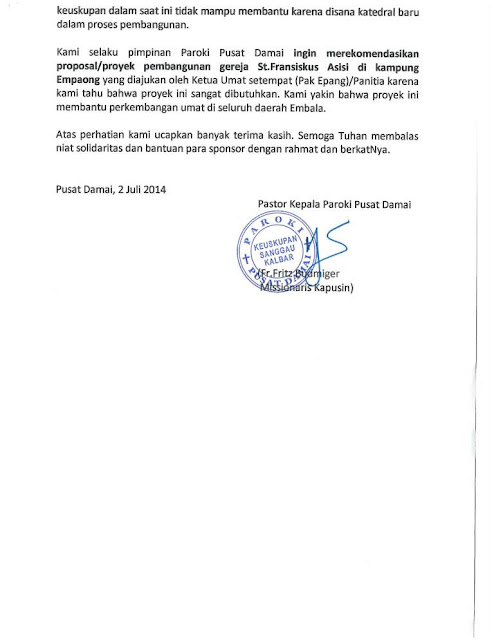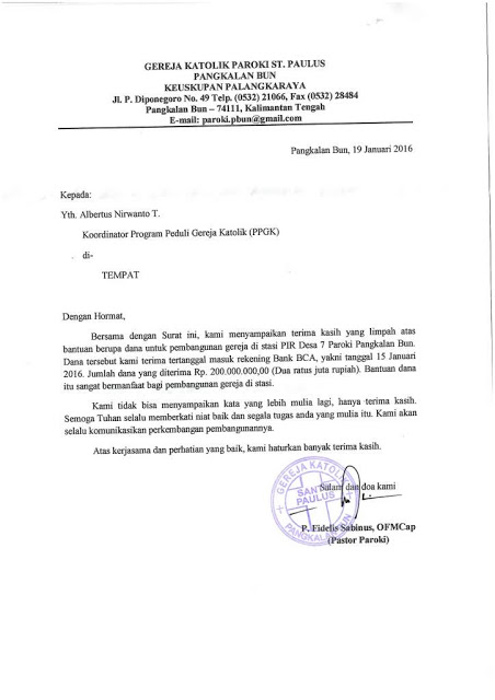 Ucapan Terima kasih dari Gereja St. Paulus, Pangkalan Bun atas bantuan untuk stasi PIR 7 |