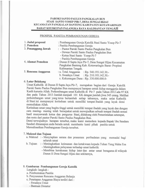 Umat Katolik di Stasi St. Yoseph, PIR 7 yang terletak di tengah perkebunan karet merupakan bagian dari Paroki St. Paulus, Pangkalan Bun, Keuskupan Palangkaraya yang hingga saat ini masih berharap dan berjuang untuk mewujudkan sebuah tempat ibadah yang layak. Jumlah umat stasi ini tahun ini mencapai kurang lebih 101 KK / 435 jiwa yang hampir seluruhnya bekerja sebagai buruh karet. Meski bekerja sebagai buruh karet, mayoritas umat yang merupakan perantau asal Flores, NTT berjuang sekuat tenaga untuk mengumpulkan swadaya berupa material lokal dan uang tunai yang saat ini berjumlah Rp 200 Jt. Kunjungan ke stasi ini dari pusat paroki kurang lebih 2 jam. Semangat umat dalam hidup menggereja sangat baik dan kompak, maka paroki sepenuhnya mendukung rencana pembangunan stasi ini menjadi lebih baik dan layak untuk digunakan sebagai tempat merayakan liturgi Ekaristi sehingga iman umat semakin bertumbuh dan berkembang. Sebagai umat Katolik Indonesia, sudah selayaknya kita membantu saudara/i seiman di pedalaman yang amat terbatas dalam segala hal untuk mewujudkan impian dan harapan mereka akan gereja yang sederhana namun layak. Maukah kita ikut terlibat?
