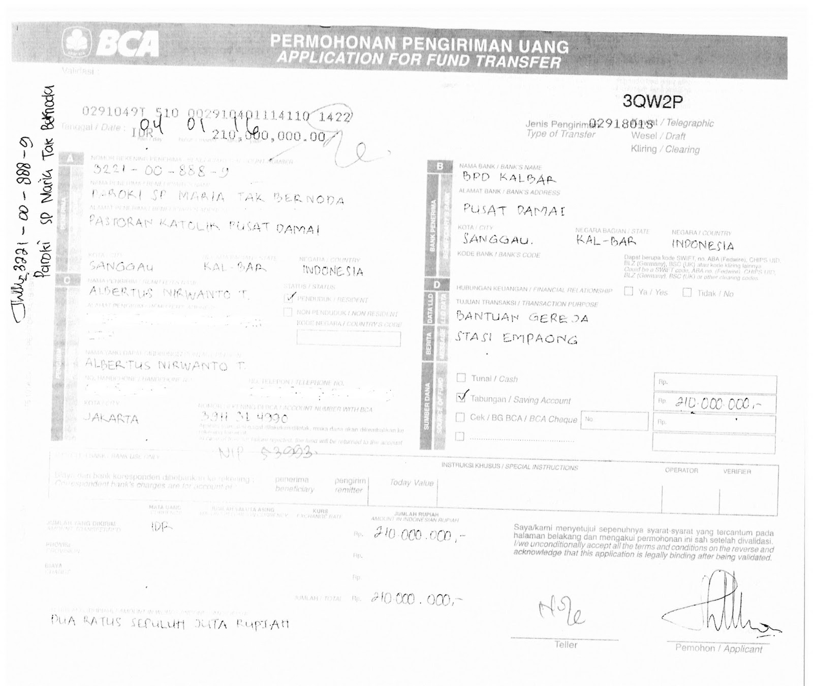 Bukti Transfer Dana Bantuan untuk Paroki Pangkalan Bun sebesar Rp 200.000.000,00 |