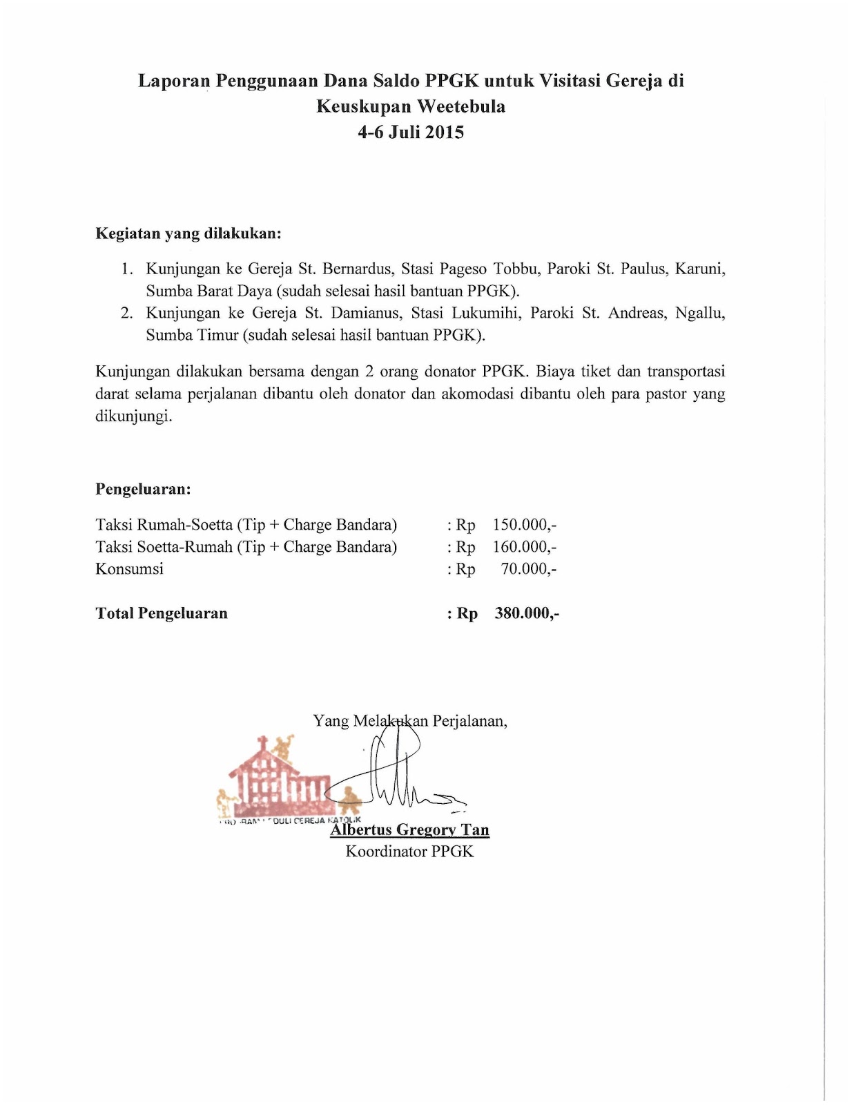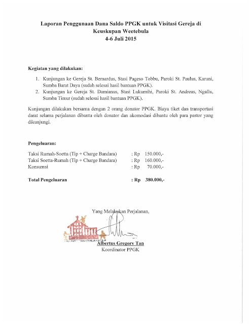 *Setiap Gereja memiliki saldo akhir PPGK. Saldo akhir akan digunakan untuk menjaga rekening PPGK tetap terisi, dan biaya transportasi mengunjungi gereja ketika selesai diperbaiki. Hal ini dikarenakan PPGK tidak memiliki sponsor-sponsor untuk kegiatan operasional. Sisa Saldo akan dikembalikan kepada Gereja disertai dengan surat pernyataan telah menerima sisa saldo bantuan, seperti yang dapat dilihat di gereja yang sudah selesai dibangun..