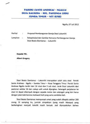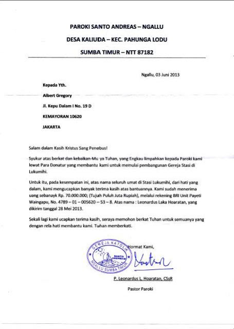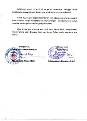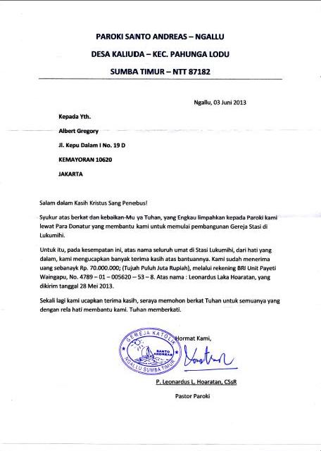 Surat Resmi Ucapan Terima Kasih Penerimaan Bantuan dari Paroki Ngallu untuk Gereja Lukumihi (Tahap I) |