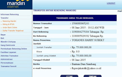Transfer I sebesar Rp 75.000.000,- pada tanggal 8 Juni 2015 (bukti transfer terlampir).