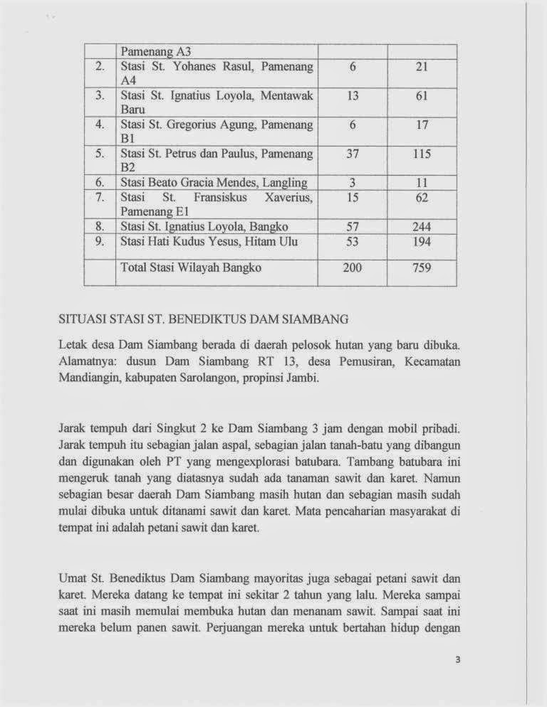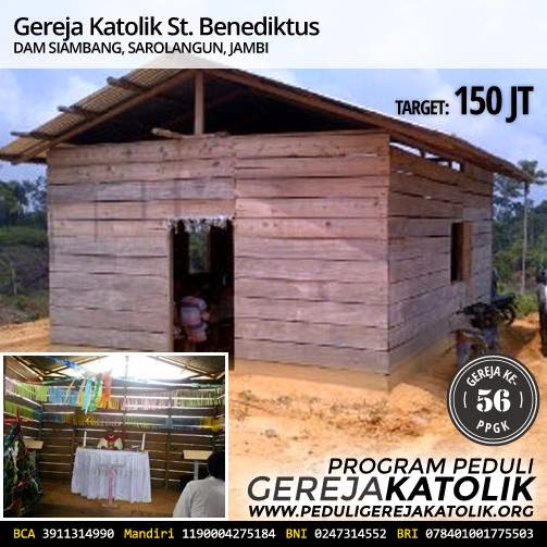 Dengan kondisi yang sangat memprihatinkan, gereja St. Benediktus berdiri di atas sebuah bukit di Dusun Dam Siambang, Desa Pemusiran, Kecamatan Mandiangin, Kabupaten Sarolangun, Jambi. Perjalanan menuju stasi ini ditempuh kurang lebih 4 jam dari pusat Paroki St. Isidorus, Singkut, Keuskupan Agung Palembang. Jalanan rusak berat karena tidak beraspal terlebih jika kondisi hujan. Umat Katolik di stasi ini berjumlah 25 KK atau 126 jiwa yang bermatapencaharian sebagai petani sawit. Pada saat kunjungan ke stasi ini untuk perayaan Natal 2014, seluruh umat hadir merayakan Ekaristi. Gereja kecil ini hanya dapat menampung sekitar 30 jiwa saja, sedangkan sisanya duduk di luar gereja beralaskan tikar. Semangat umat Dam Siambang dalam menggereja patut diacungi jempol karena kekompakan dan kesatuan mereka dalam mempersiapkan perayaan-perayaan liturgi yang sederhana namun bersahaja. Tidak dapat dibayangkan apabila hujan, dengan atap yang bocor, dinding papan yang sudah lapuk dan lantai tanah kondisinya akan jauh lebih memprihatinkan. Apakah hati kita tergerak? Mari mengulurkan tangan. Bukan soal memperbaiki fisik saja, tapi jauh lebih daripada itu, sebagai bentuk dukungan terhadap perkembangan iman dan hidup menggereja di stasi ini dengan lebih baik.