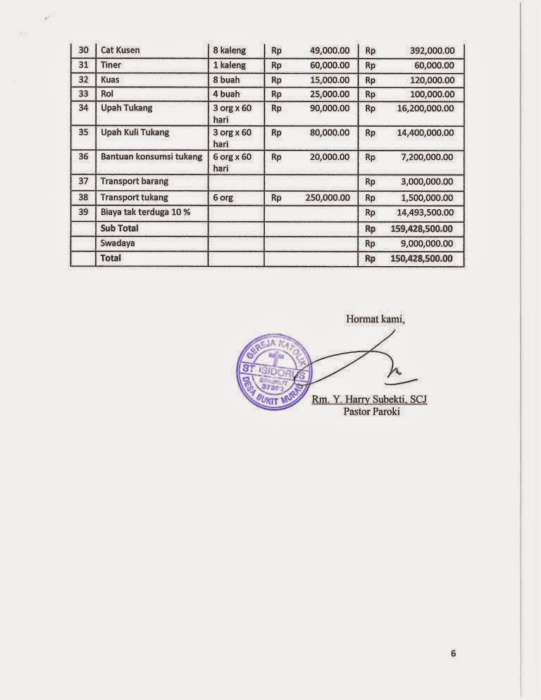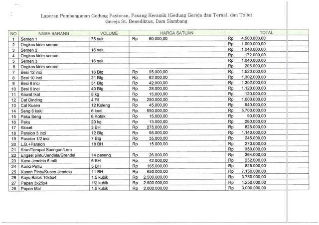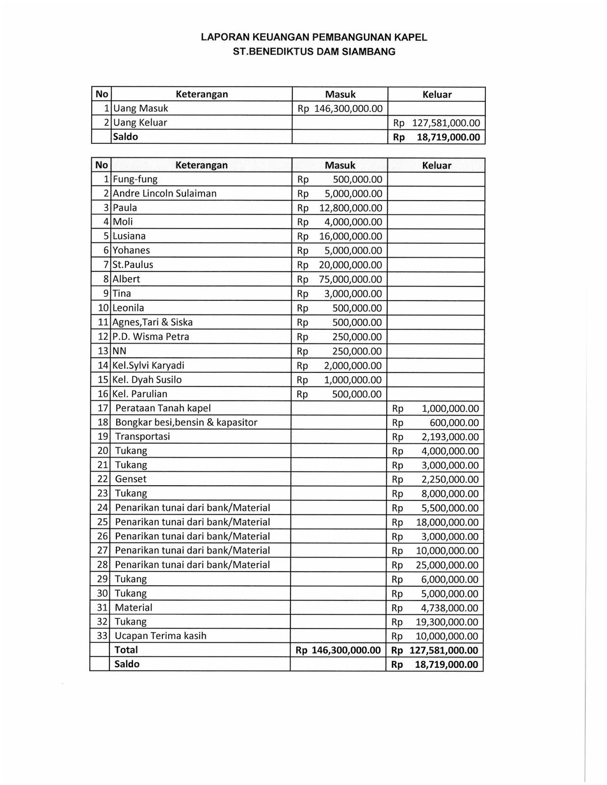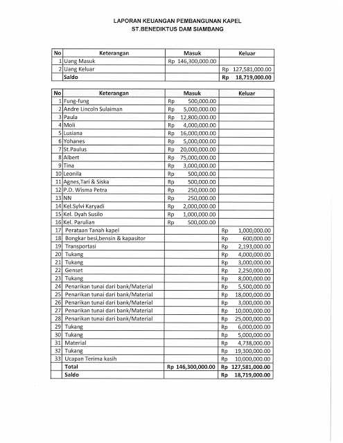Syukur kepada Allah atas terselesaikannya kegiatan pencarian dana untuk Gereja Katolik St. Benediktus, Dam Siambang, Sarolangun, Jambi, Keuskupan Agung Palembang. Jumlah total dana bantuan yang terkumpul adalah sebanyak Rp 177.015.849,- dengan rincian sebagai berikut: