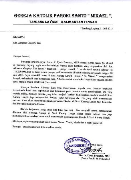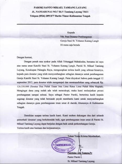 Surat Resmi Ucapan Terima Kasih Penerimaan Bantuan dari Paroki Tamiang Layang untuk Gereja Karang Langit (Tahap I) |