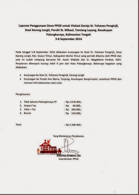 Dana yang masuk melalui Rekening PPGK di atas telah kami transfer ke Rekening Paroki Tamiang Layang sebesar Rp 105.000.000 pada tanggal 10 September 2012 (bukti transfer terlampir).