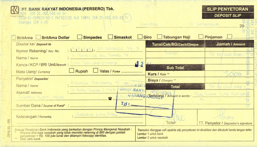 - Jumlah dana bantuan yang masuk melalui Rekening PPGK untuk Gerakan Lima Ribu: Rp 20.000.000,-