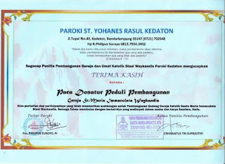 Sertifikat Ucapan Terima Kasih Untuk Para Donatur dari Gereja Paroki Kedaton |