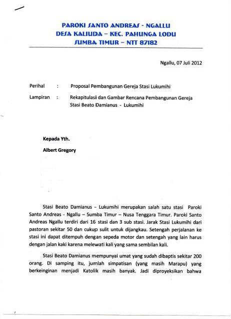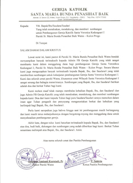 Surat Resmi Ucapan Terima Kasih Penerimaan Bantuan dari Paroki Wates untuk Gereja Kedungjati |
