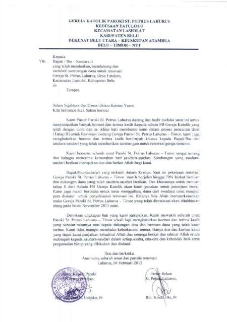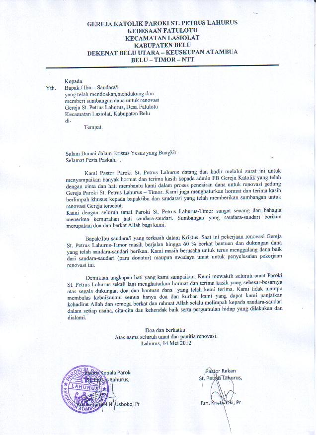 Surat Resmi Ucapan Terima Kasih Penerimaan Bantuan dari Paroki Lahurus untuk Gereja Paroki Lahurus |