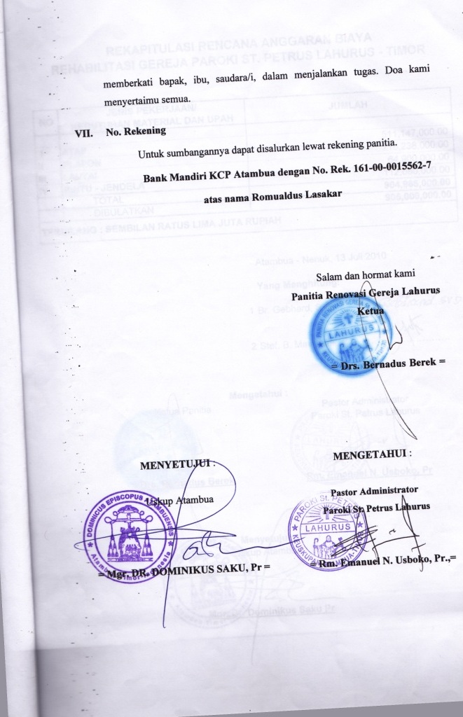 Syukur kepada Allah atas terselesaikannya kegiatan pencarian dana untuk Gereja Katolik St. Petrus, Lahurus, Atambua. Jumlah total dana bantuan yang terkumpul adalah sebanyak