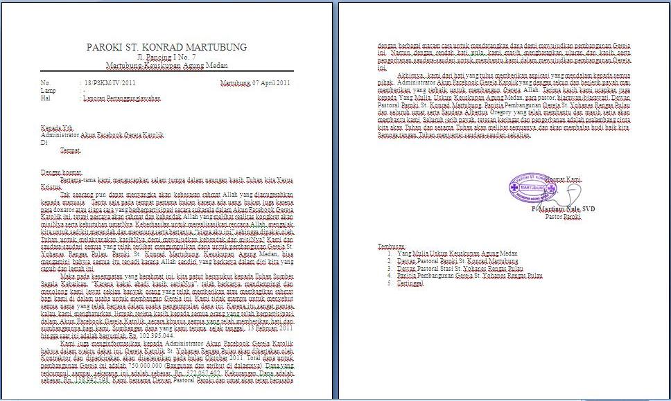 Surat Resmi Ucapan Terima Kasih Penerimaan Bantuan dari Paroki Martubung untuk Gereja Rengas Pulau |