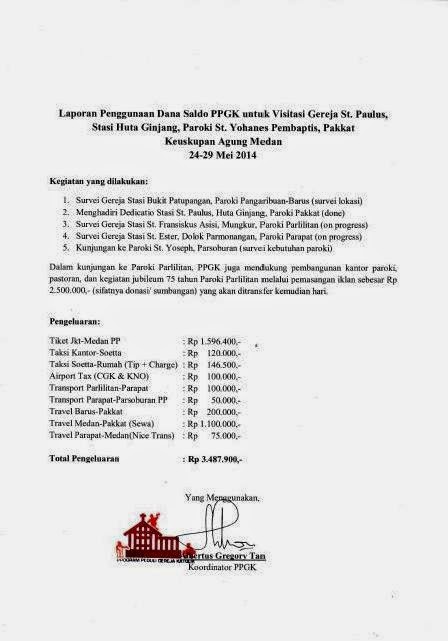 Dana yang masuk melalui Rekening PPGK di atas telah kami transfer ke Rekening Paroki Pakkat sebesar Rp 100.000.000 pada tanggal 3 April 2014 (bukti transfer terlampir).