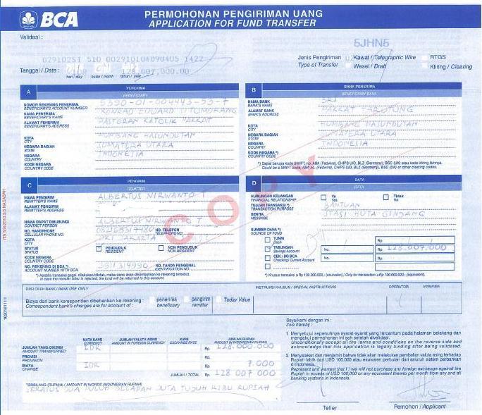 Dana yang masuk melalui Rekening PPGK di atas telah kami transfer ke Rekening Paroki Pakkat sebesar Rp 128.000.000 pada tanggal 1 April 2013 (bukti transfer terlampir).
