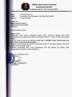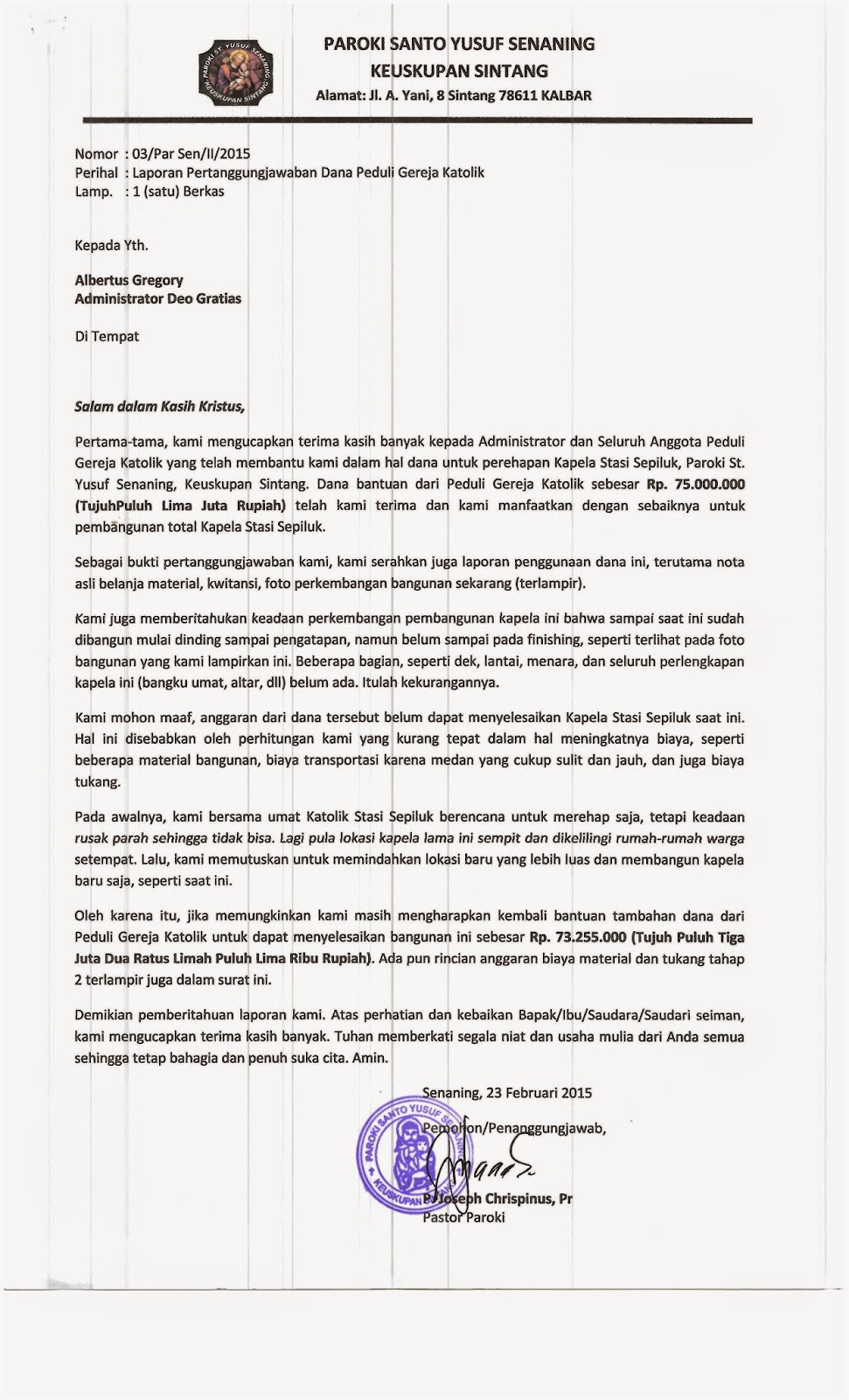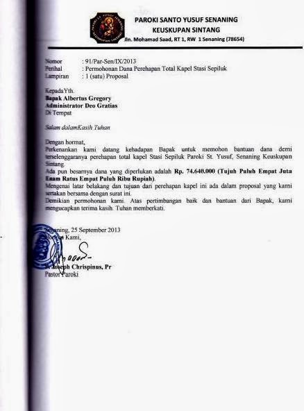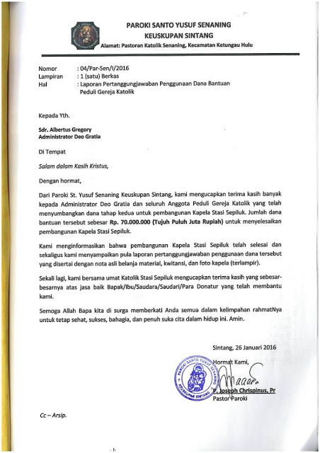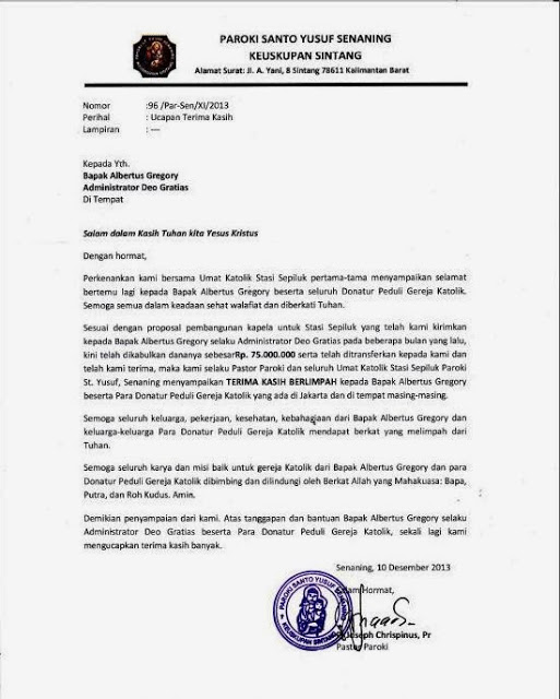 Surat Resmi Ucapan Terima Kasih Penerimaan Bantuan dari Paroki Senaning, Sintang |