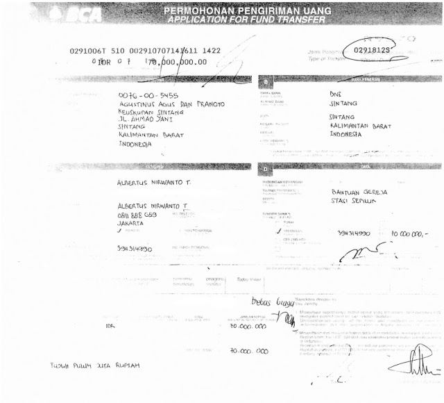 Dana yang masuk melalui Rekening PPGK di atas telah kami transfer ke Rekening Keuskupan Sintang (BNI a/n Agustinus Agus dan Pranoto) sebesar Rp 70.000.000 pada tanggal 7 Juli 2015 (bukti transfer terlampir).