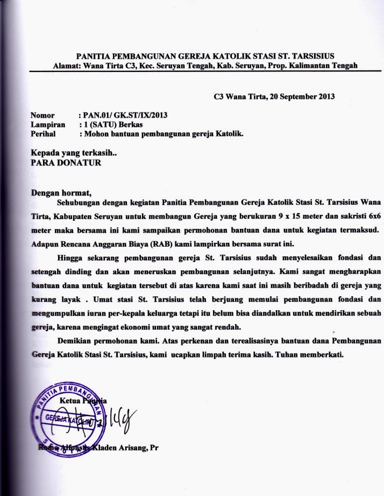Surat Resmi Ucapan Terima Kasih Penerimaan Bantuan dari Paroki Rantau Pulut, Seruyan |