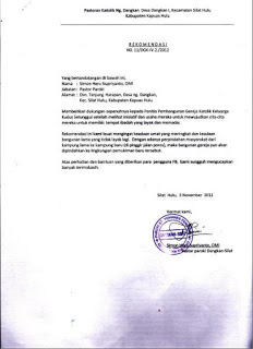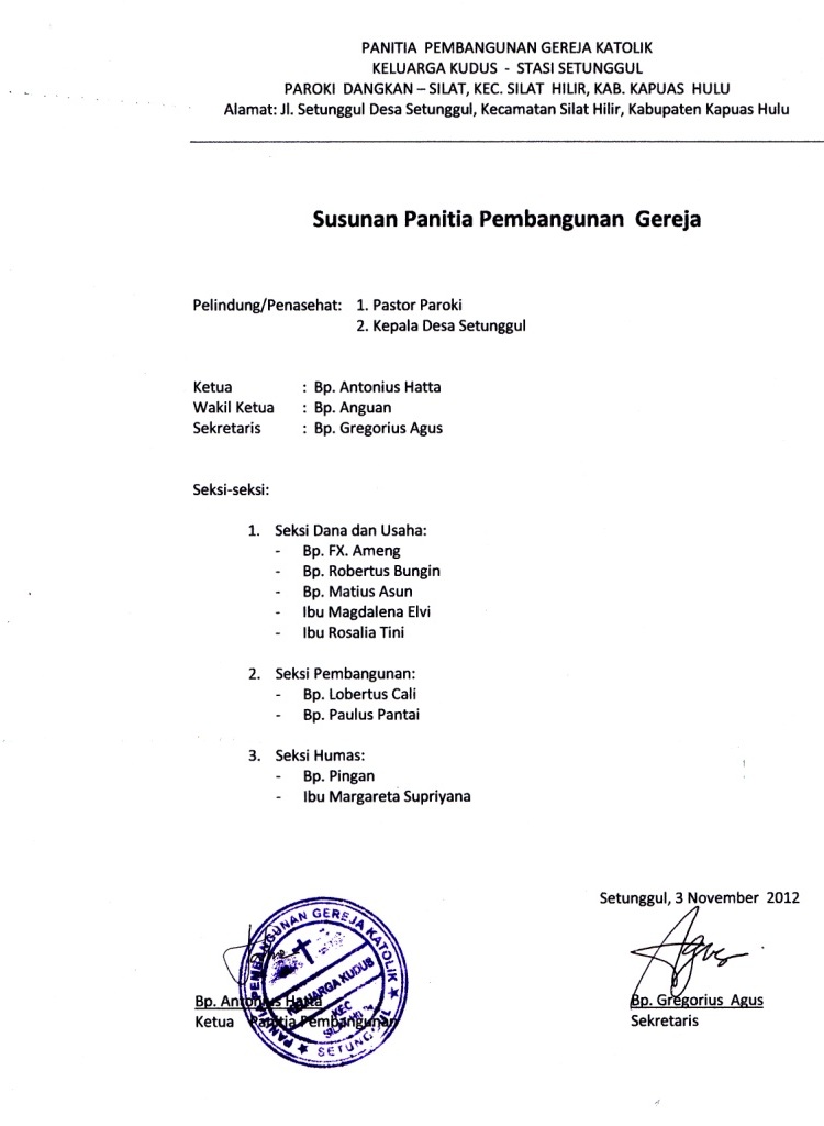 Surat Resmi Ucapan Terima Kasih Penerimaan Bantuan dari Paroki Dangkan Silat, Kapuas Hulu
